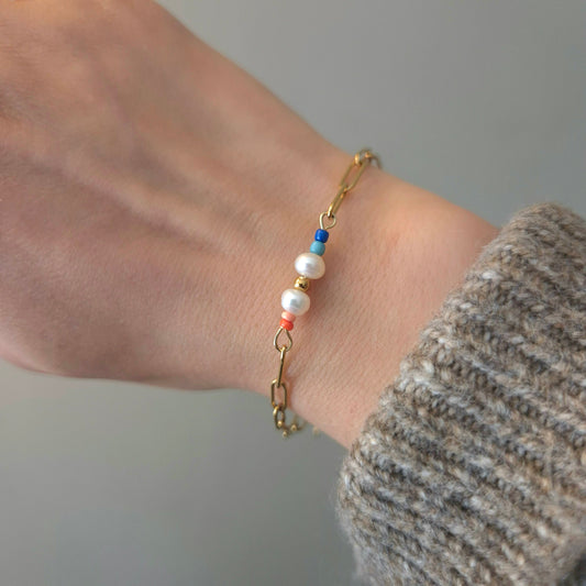 J’emploie des perles raffinées associées à des métaux durables comme l’acier inoxydable et le plaqué or, afin de garantir la longévité de vos bijoux